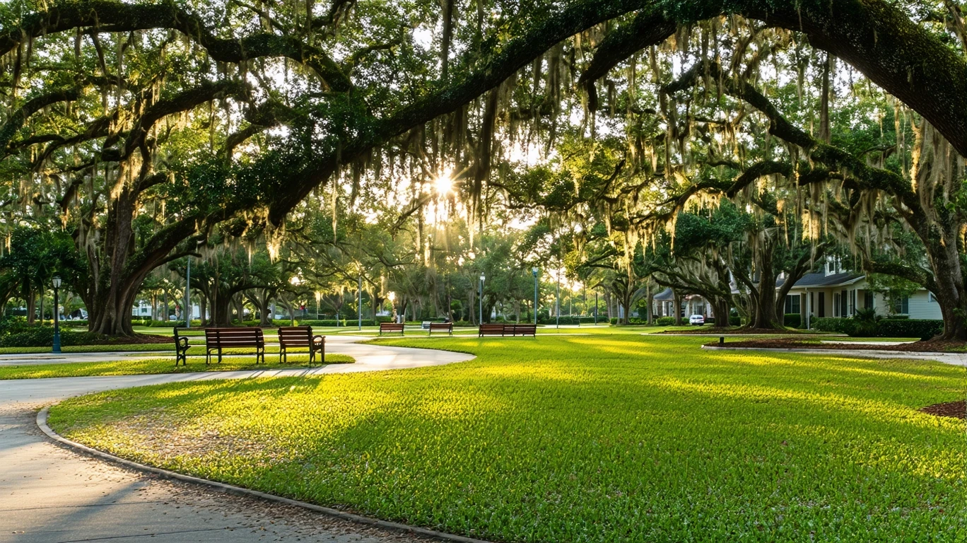 A peaceful park lawn with benches beneath oak trees in Miramar, Florida at golden hour.