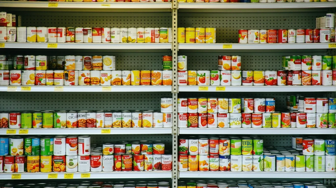 Shelves of neatly stacked canned goods in a small grocery store.