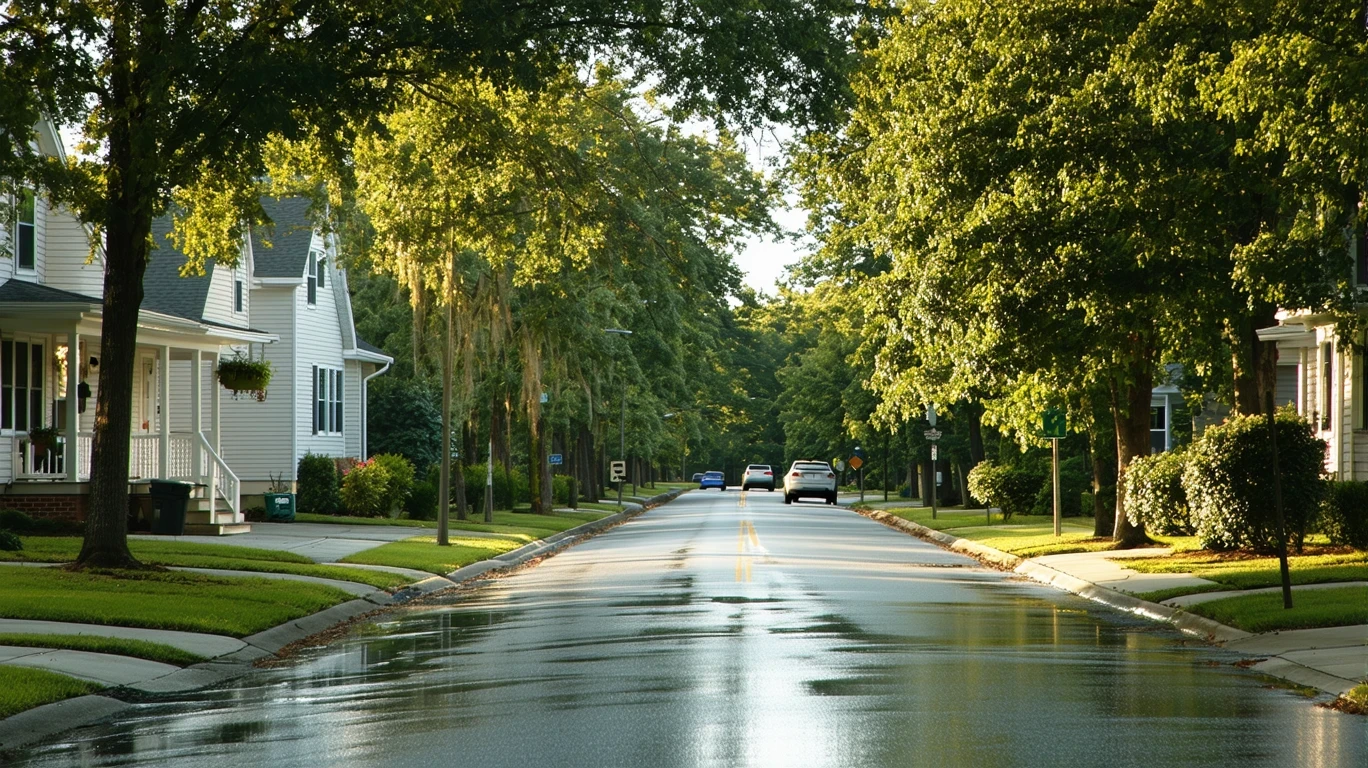 A suburban street in Mount Sterling, KY lined with palm trees and modest single-story homes on a warm afternoon after a brief rain shower.
