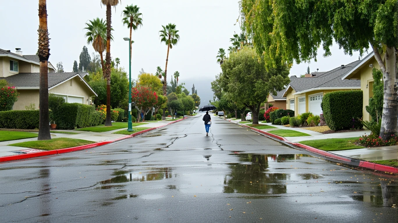 Palm-lined avenue in Mountain View’s suburban neighborhood after a passing shower.