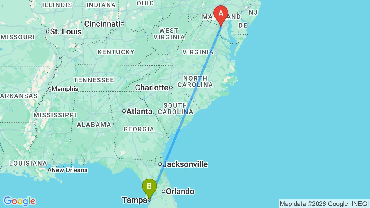The move from Washington to Tampa covers roughly 900 miles and typically takes two days by road or a few hours by air. Most professional movers charge based on weight and distance, and the corridor is well-served by national moving companies. Driving yourself requires planning for overnight stops, and the route follows I-95 south through Virginia and the Carolinas before cutting west toward Florida’s Gulf Coast.