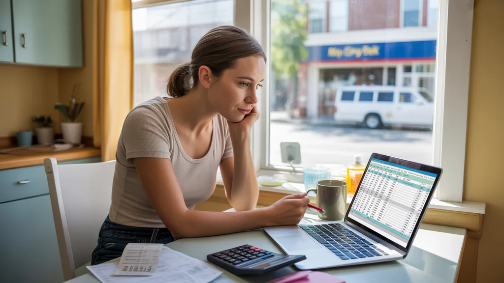 Woman budgeting expenses at kitchen table in Mt Juliet apartment