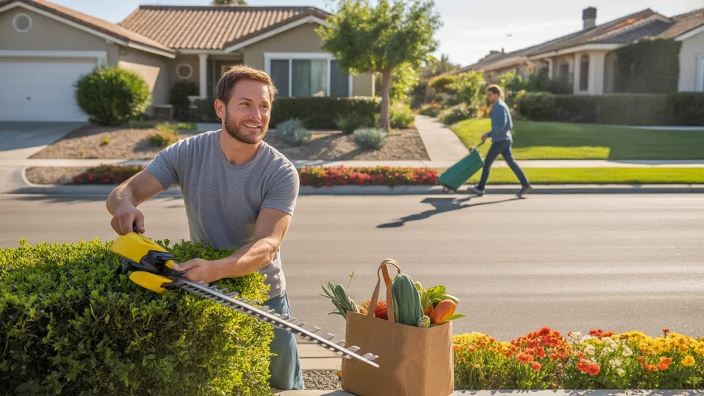 Man trimming hedges in front of suburban home in Murrieta, California