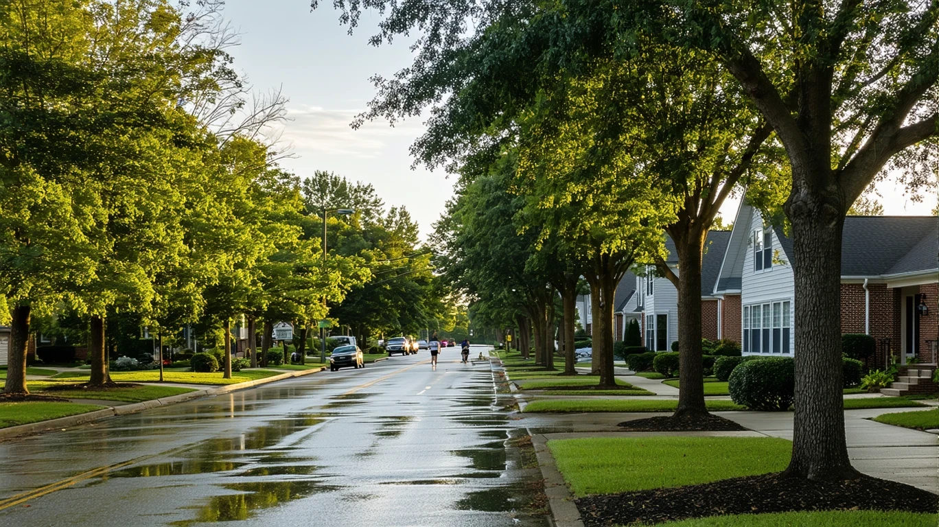 A residential street in Columbus, Ohio at sunrise, with small single-story homes, mature trees casting long shadows, and a couple walking.