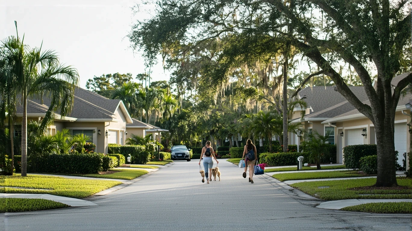 A woman carrying groceries walks along a sidewalk in a suburban New Port Richey neighborhood with stucco homes and palm trees.