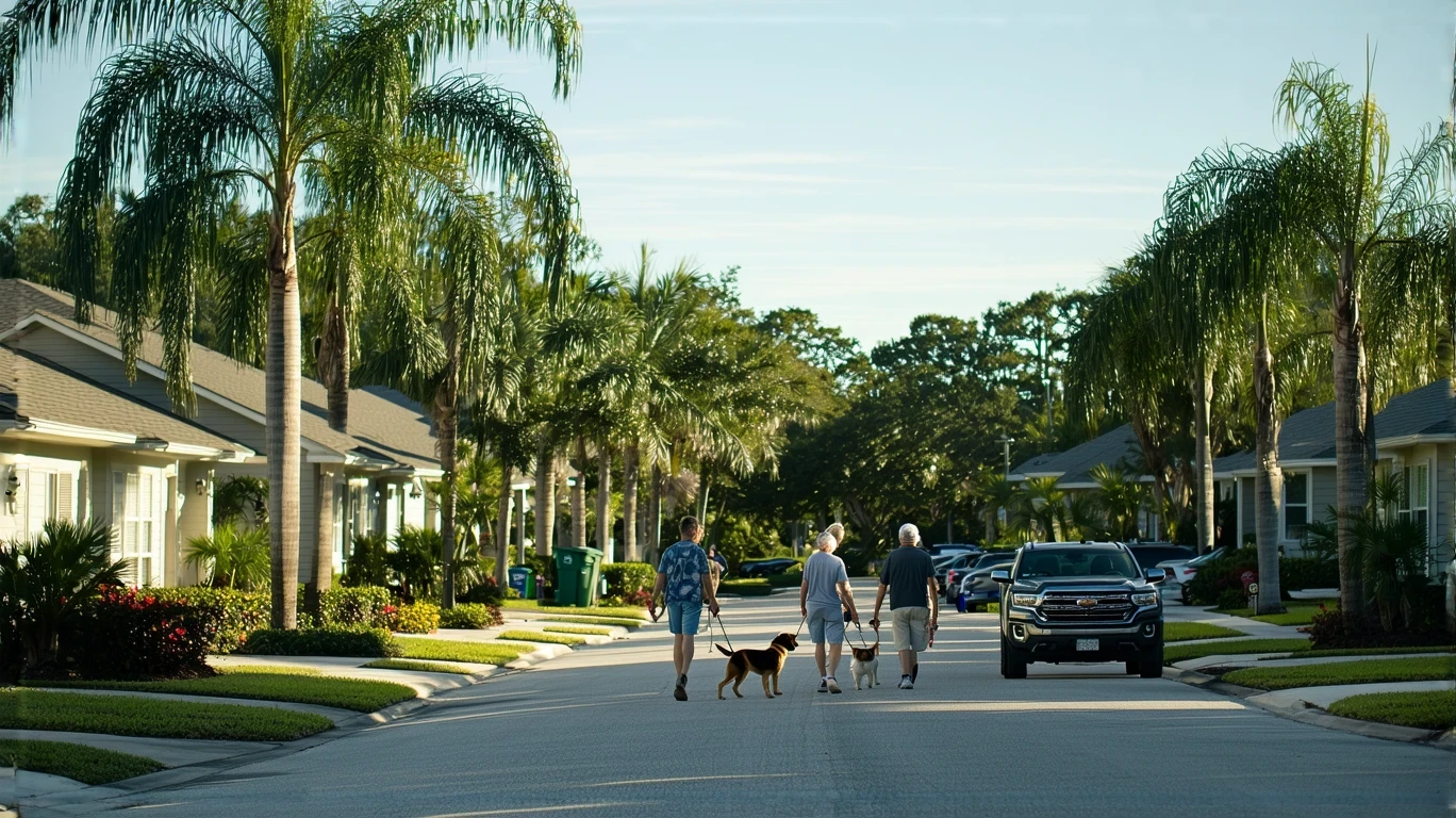 A quiet residential street in New Port Richey, Florida with a couple walking their dog past craftsman-style homes and tropical landscaping.