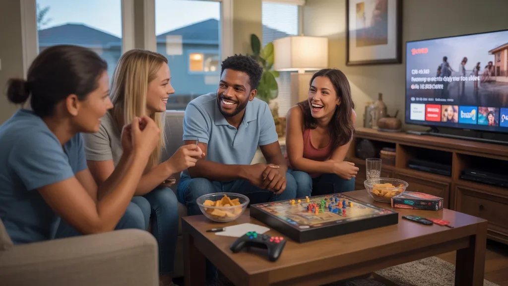 Friends enjoying a board game night in a cozy North Las Vegas living room