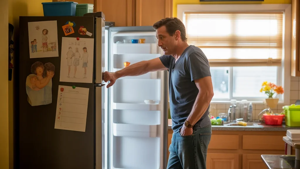 A father stands in front of an open refrigerator, deep in thought, in a warmly lit North Las Vegas kitchen.