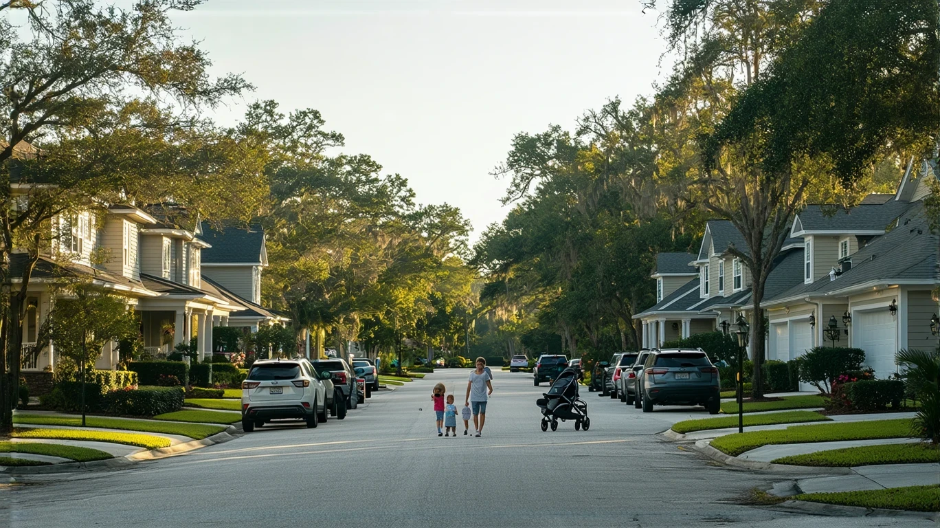 Modest craftsman-style homes line a quiet residential street in Ocoee, Florida on a sunny day. A young family walks along the sidewalk.
