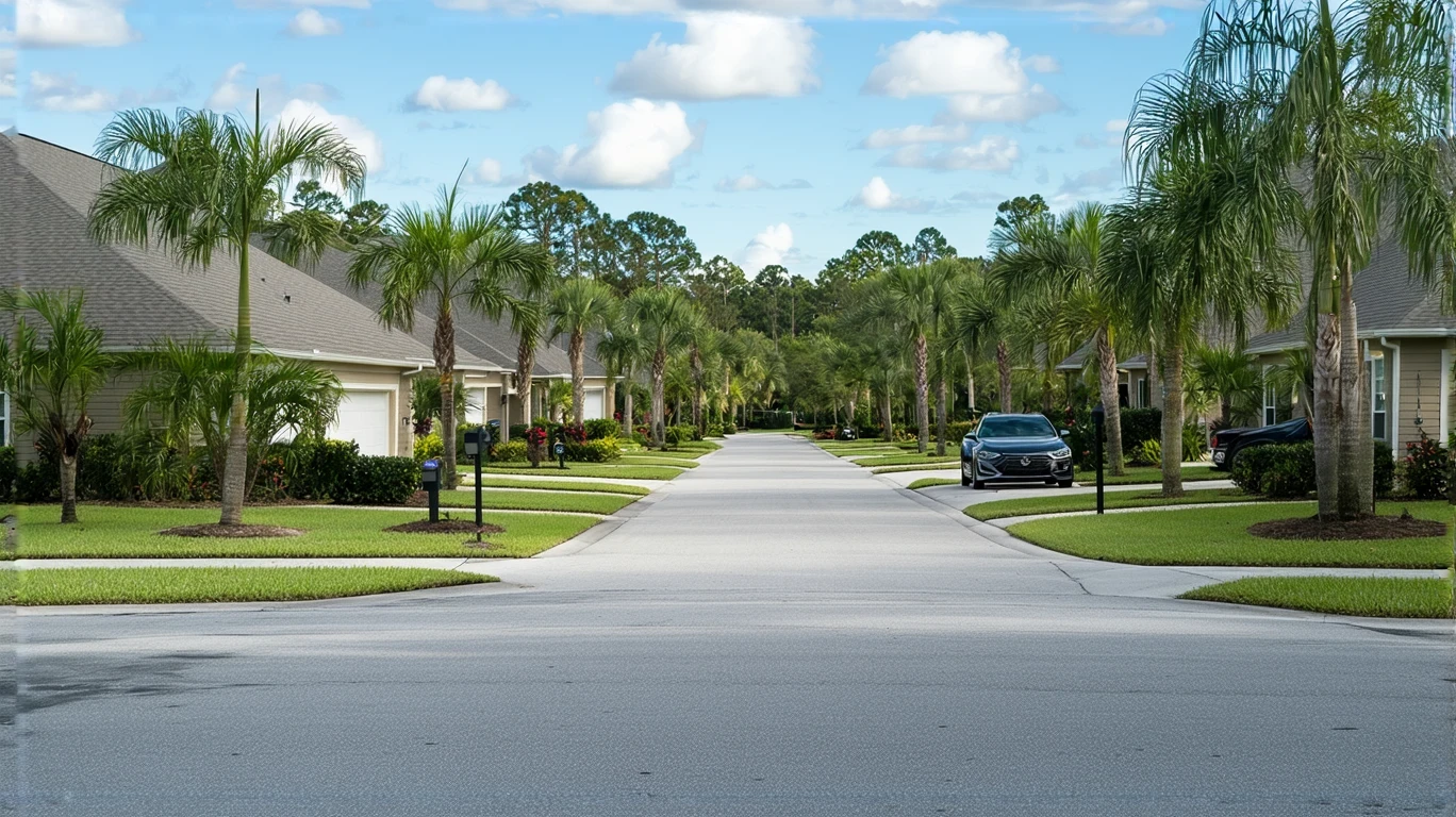 Modest stucco homes with tidy lawns on a quiet street in Ocoee, Florida on a clear day
