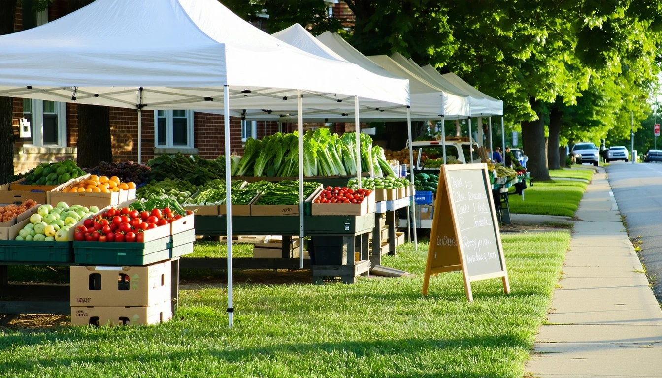 Farmer's market with fresh produce under canvas awnings in Ofallon, Illinois.