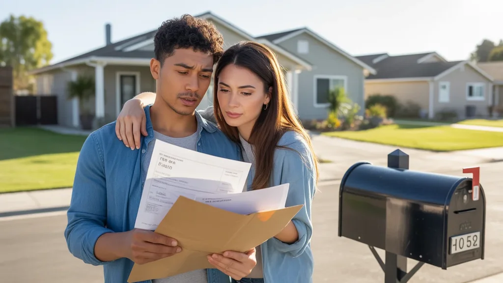 Couple reviewing HOA statement outside new home in Ontario, CA