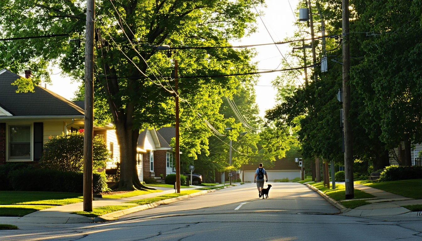 A tree-lined suburban street in Overland Park, Kansas with single-story homes and a pedestrian walking a dog on the sidewalk.