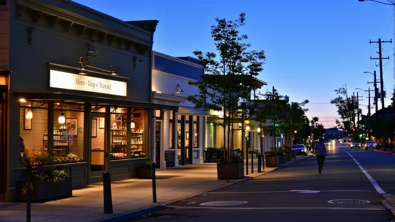 A peaceful evening in a Palo Alto neighborhood shopping district.
