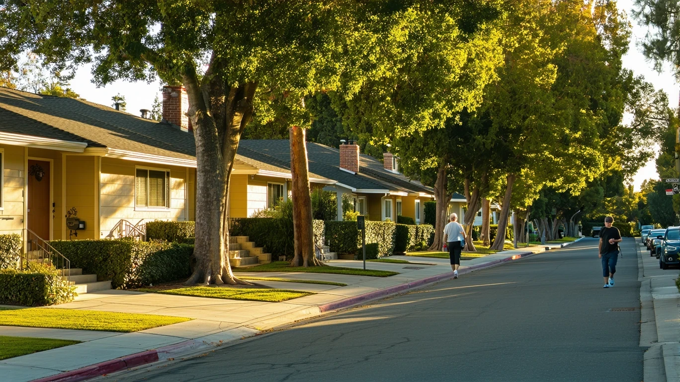 Quiet residential street in Palo Alto, CA with one-story homes and leafy trees at sunrise.