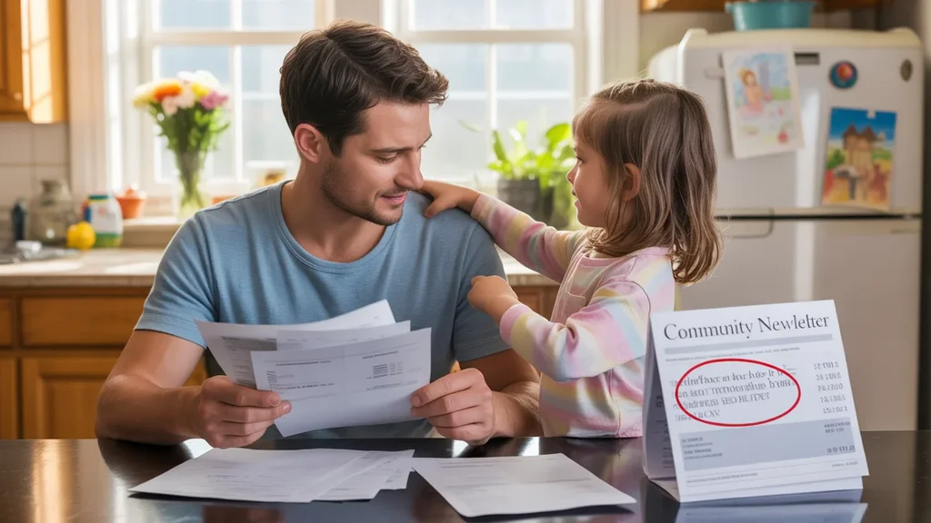 Father and daughter reviewing utility bills and HOA notice in kitchen