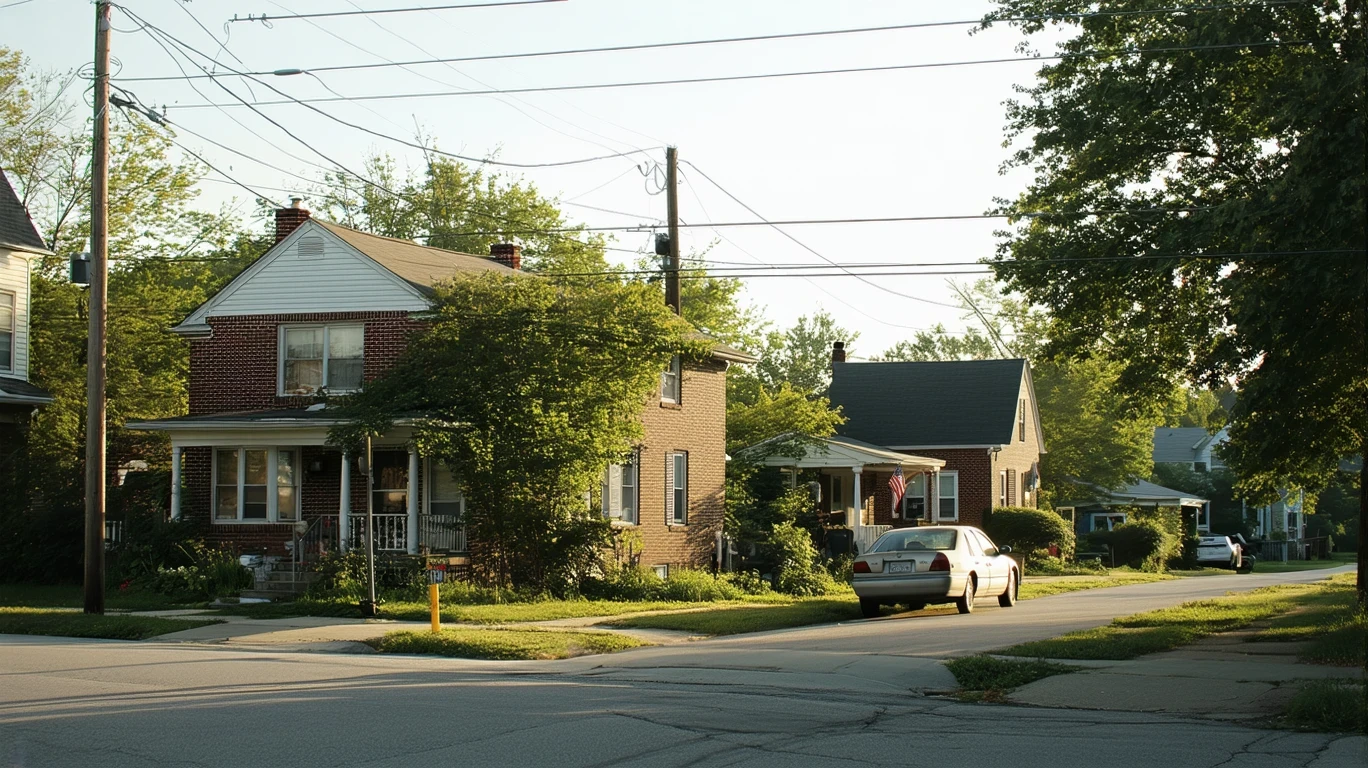A quiet residential street corner in a small town on a sunny day, with modest homes, patchy lawns, and an old car parked on the curb.
