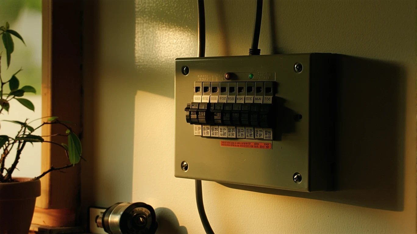 A labeled household fuse box illuminated by a flashlight in a dimly lit room.