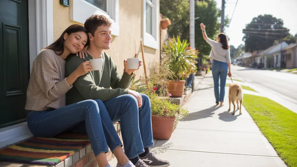 Couple sitting on front steps of Pasadena home at sunrise