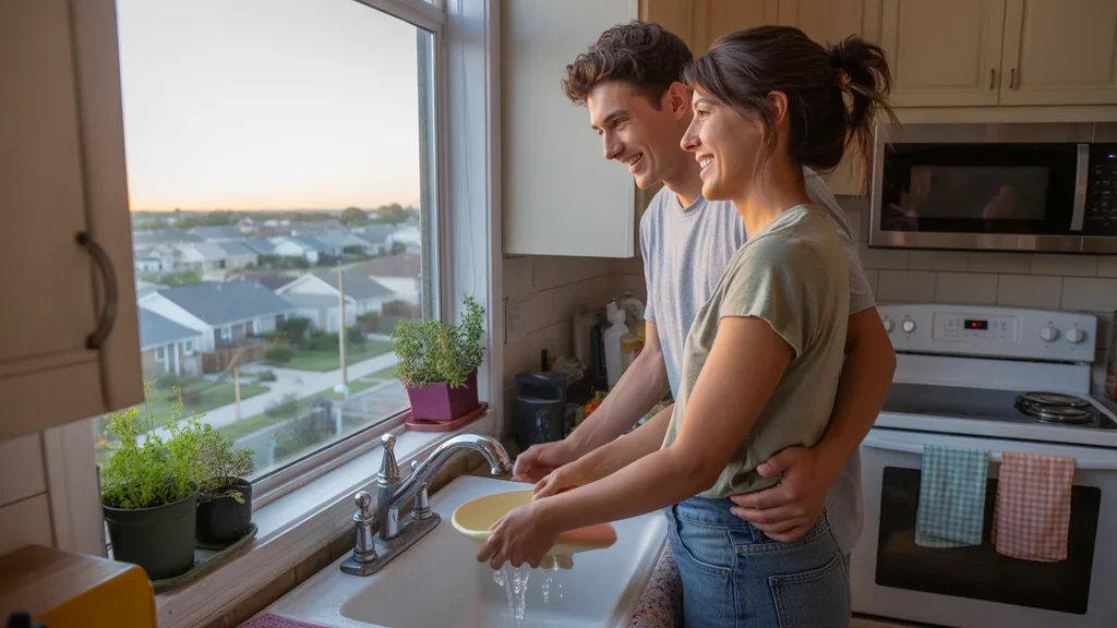 Couple washing dishes together at kitchen sink in Plano, TX home at sunset