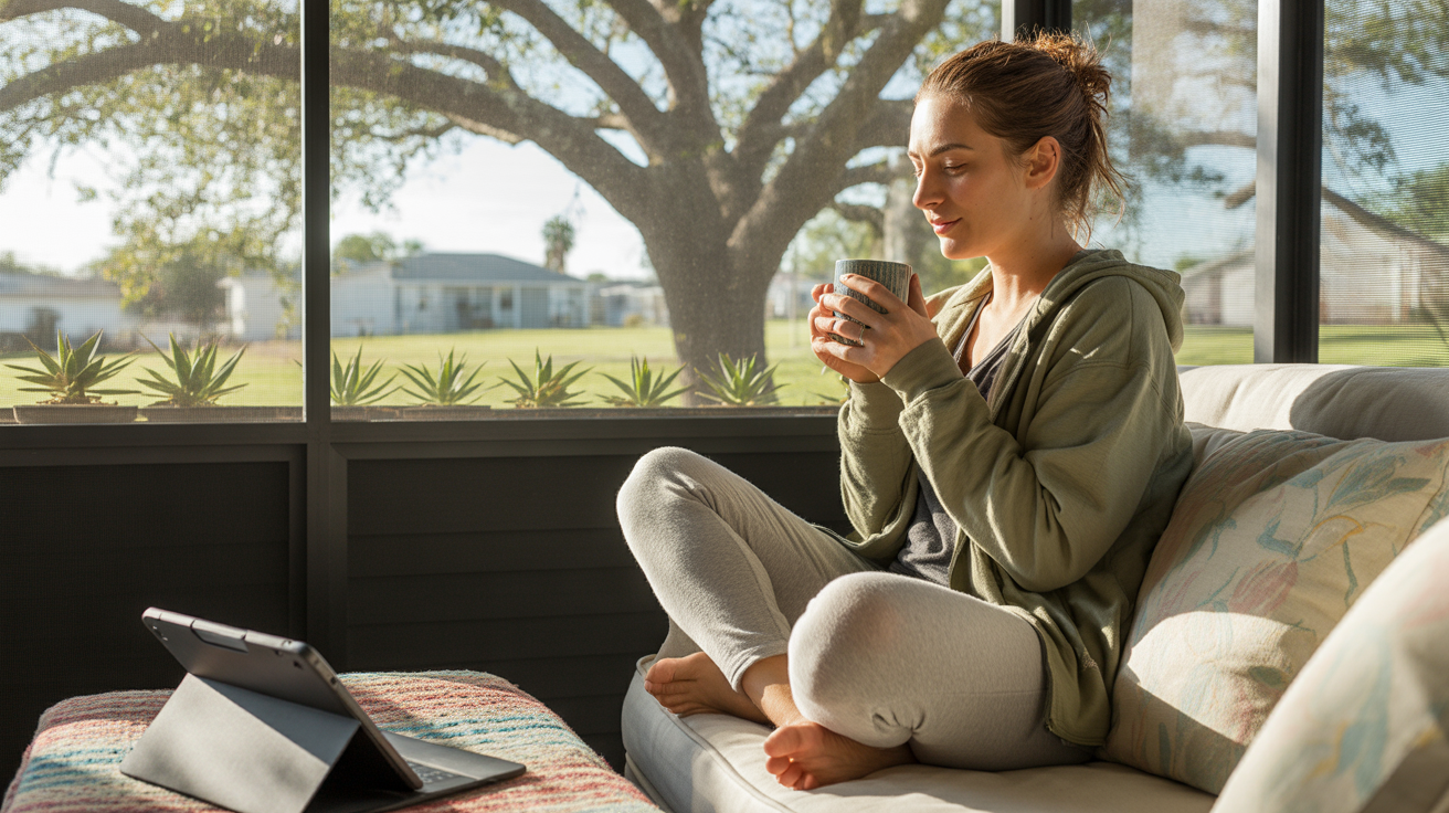 Woman drinking coffee on her screened-in porch in Plant City, FL with a tablet beside her
