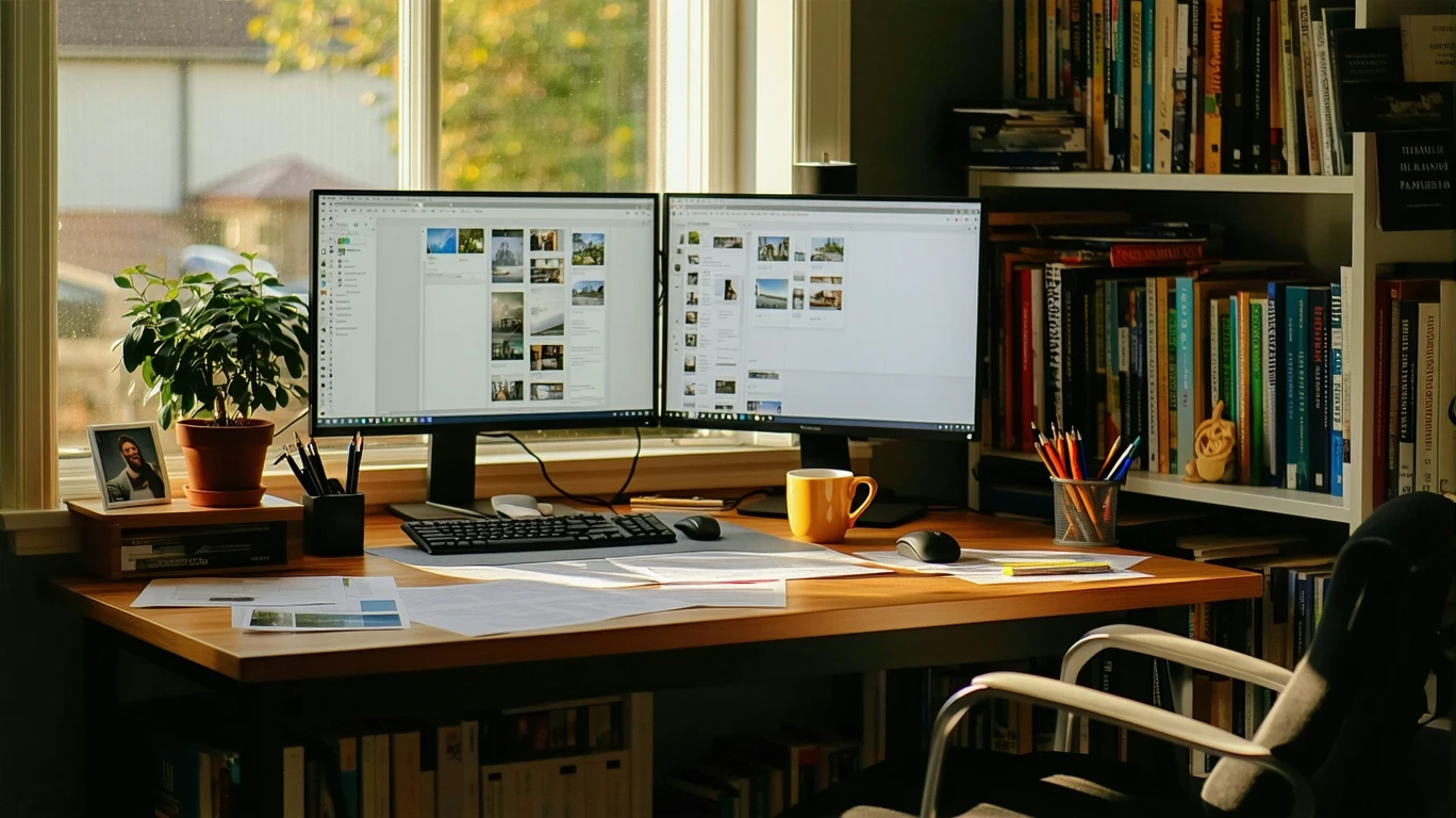 A home office desk with dual monitors, scattered papers, and a coffee mug, lit by warm sunlight from a nearby window.