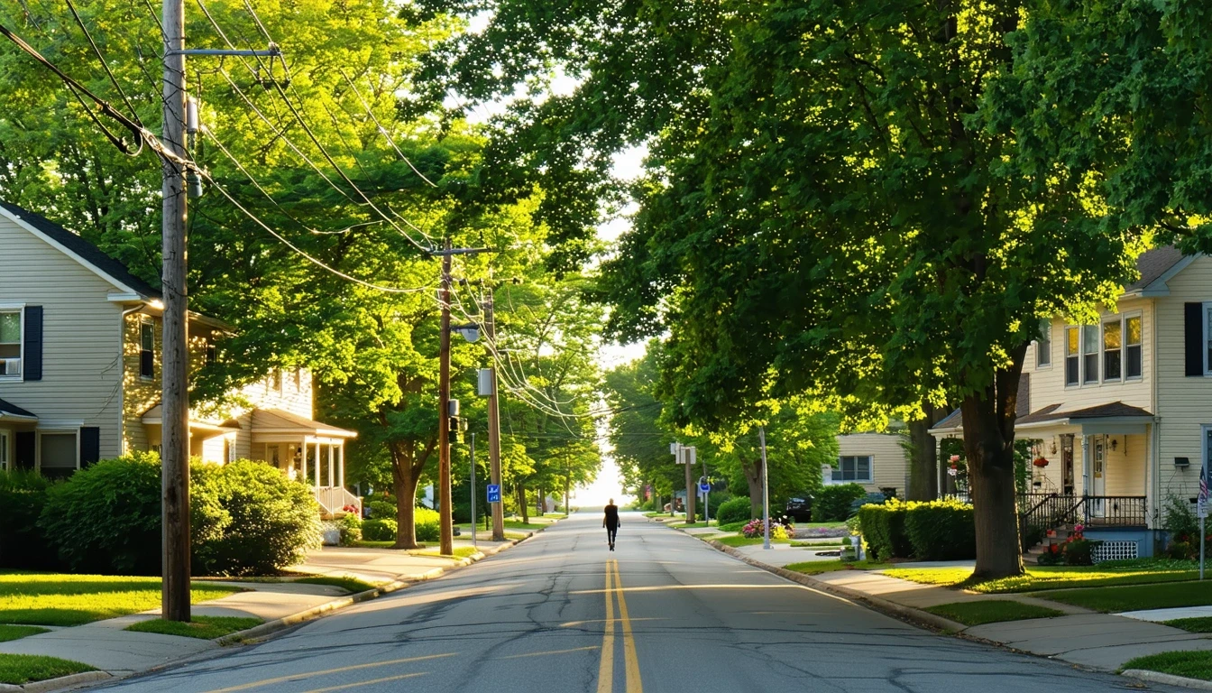 Sunlight filters through maple trees on a quiet street in Pontiac.