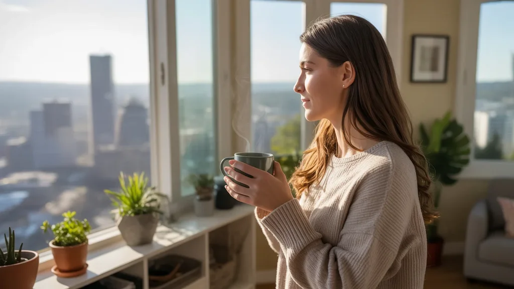 Woman drinking coffee and looking out apartment window in Portland, Oregon
