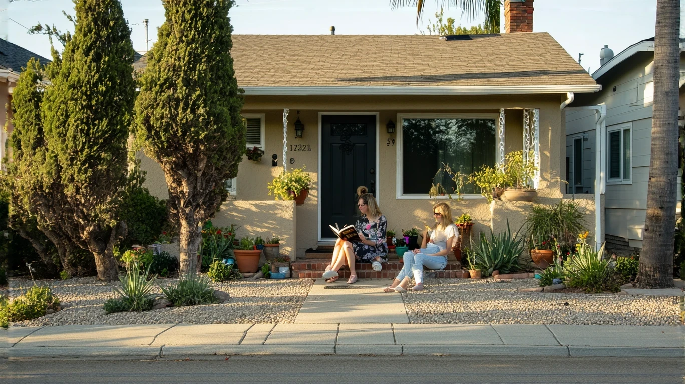 Woman reading a book on the front porch steps of a modest California bungalow with a small landscaped yard.