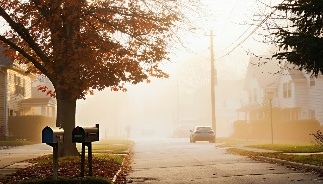 A foggy morning street in Reston, VA with mailboxes, a parked car, and maple trees lining the sidewalk in front of well-maintained homes.