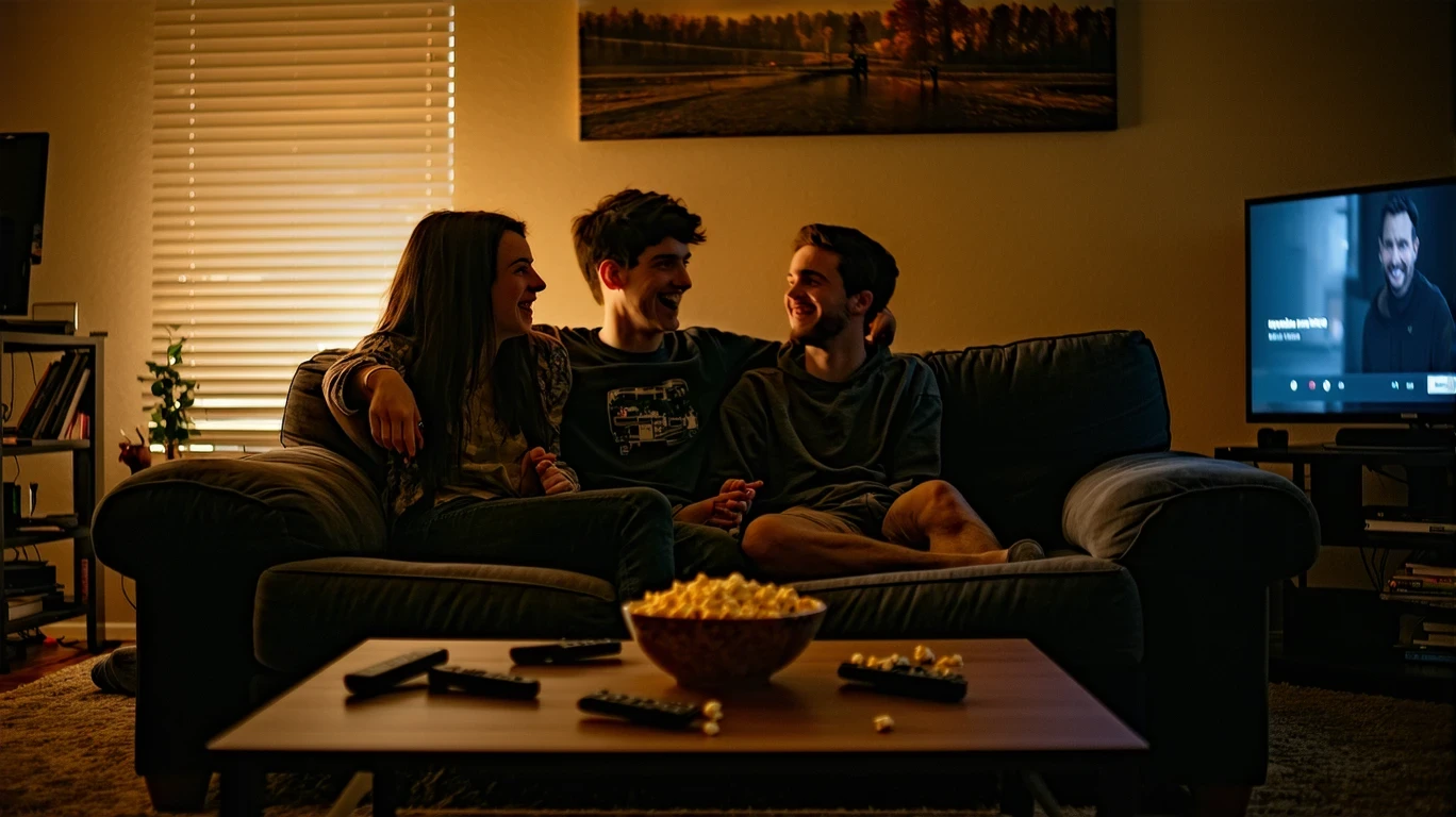 Two roommates laughing together on a couch in a dimly lit living room, with a TV paused in the background.