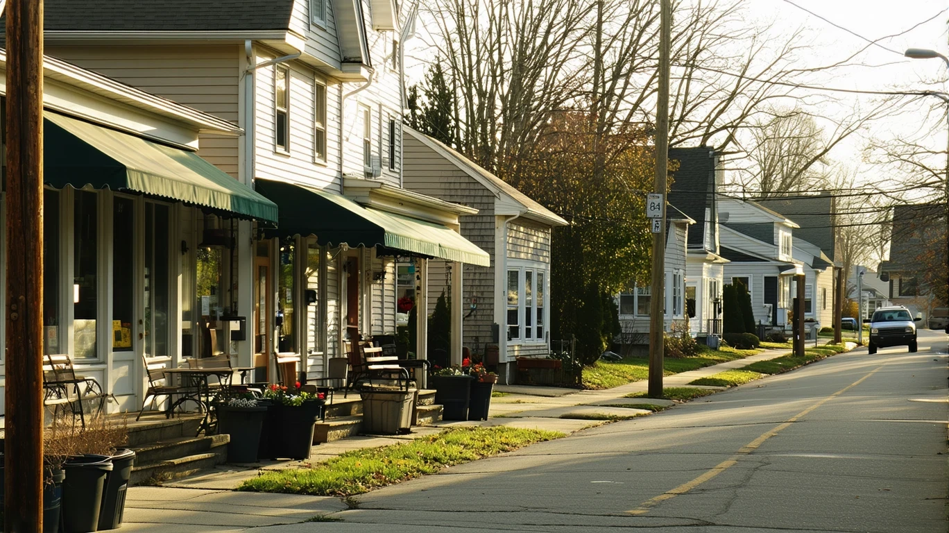 Residential street in Reynoldsburg, Ohio with small shops and homes in the late afternoon sun.