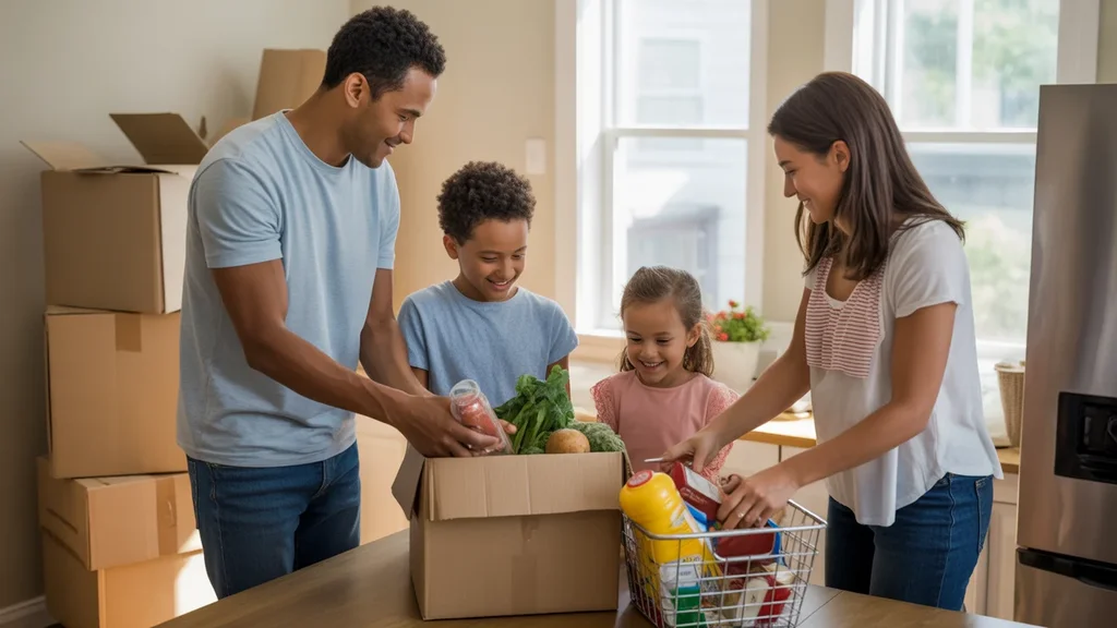 Family unpacking affordable groceries in their new Richmond, KY home kitchen