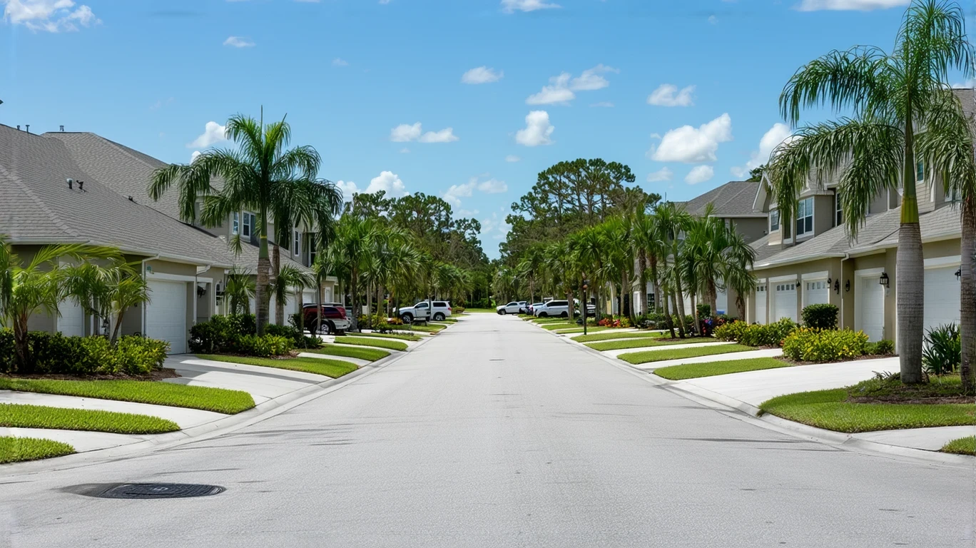 A suburban street in Riverview, Florida lined with modest single-family homes and palm trees.