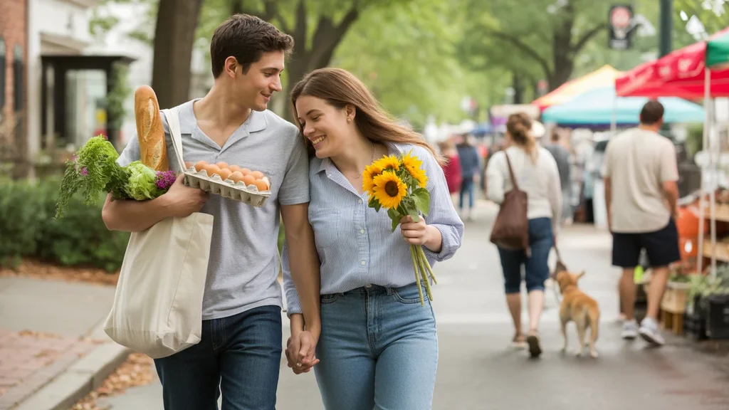A couple walks home from the Roswell farmer's market with fresh groceries and flowers, enjoying a sunny afternoon together.