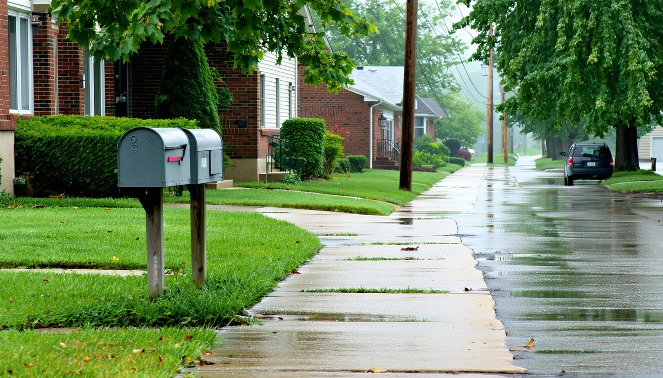 A curving sidewalk on a residential street in Saint Louis with mailboxes and small homes on a cloudy day.