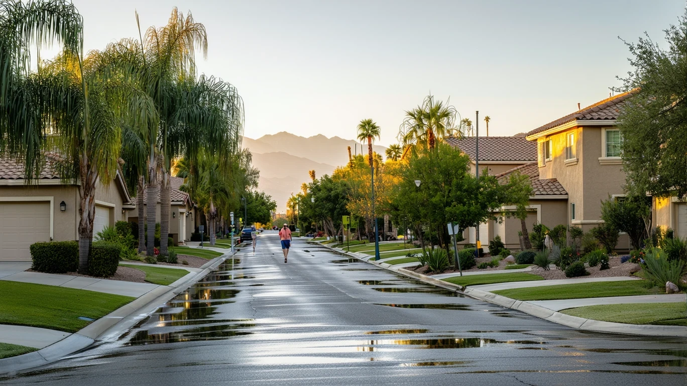 A suburban street in Salt Lake City with palm trees reflected in puddles on the sidewalk after a rain shower, a few people walking in the distance.