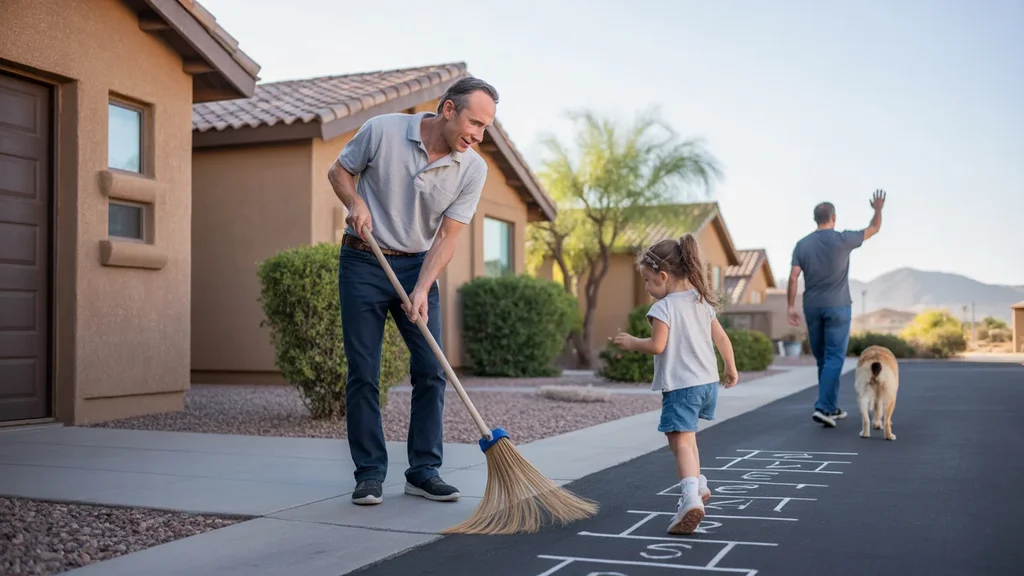 Man sweeps driveway of duplex in San Tan Valley Arizona as young girl plays hopscotch nearby at sunset