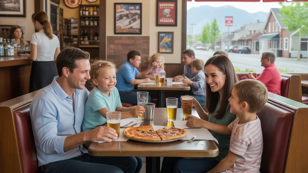 A young family enjoying pizza together at a cozy local restaurant in Sandy, Utah.