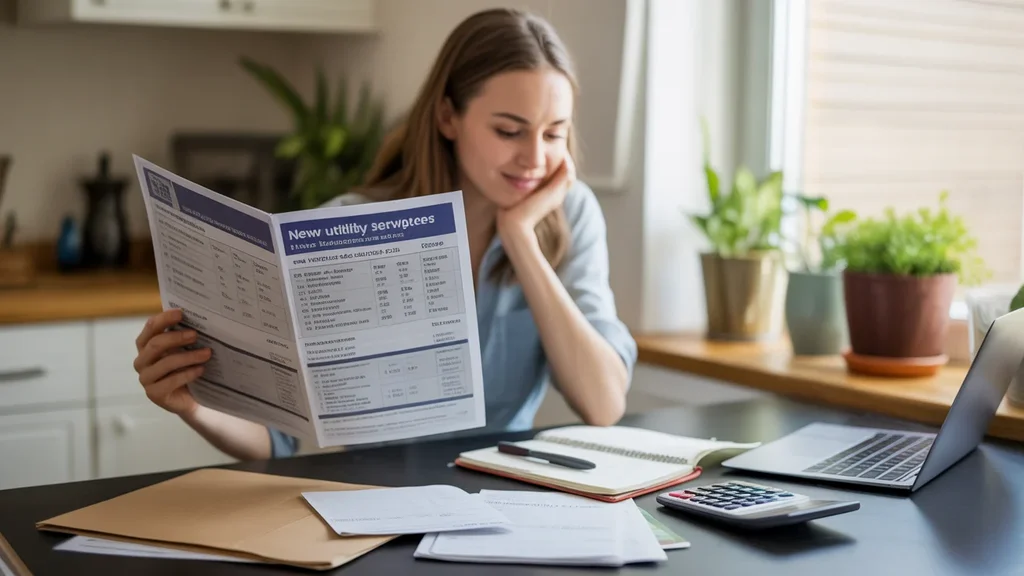 Woman reviewing utility fees while budgeting at kitchen table in Sandy apartment