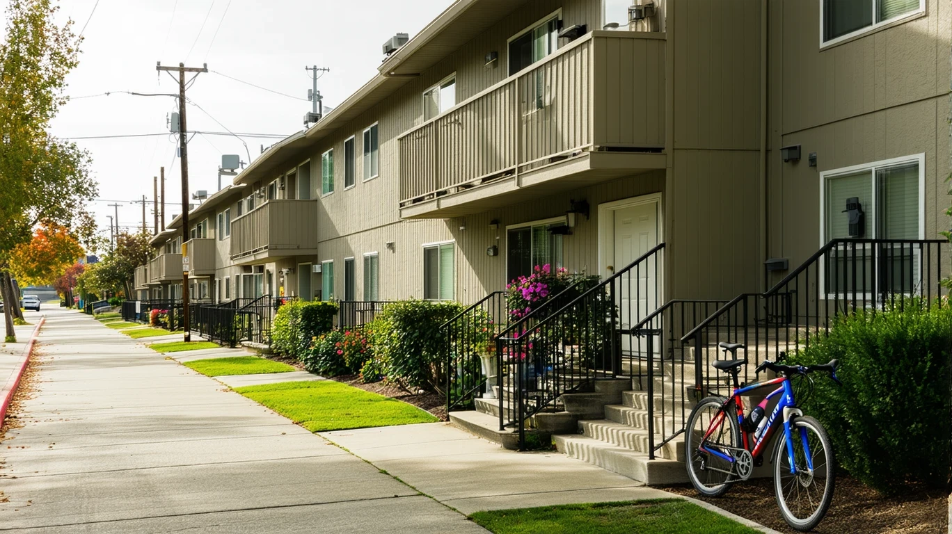 A small, modern apartment building in Santa Clara with bicycles parked outside and potted plants by the doors.