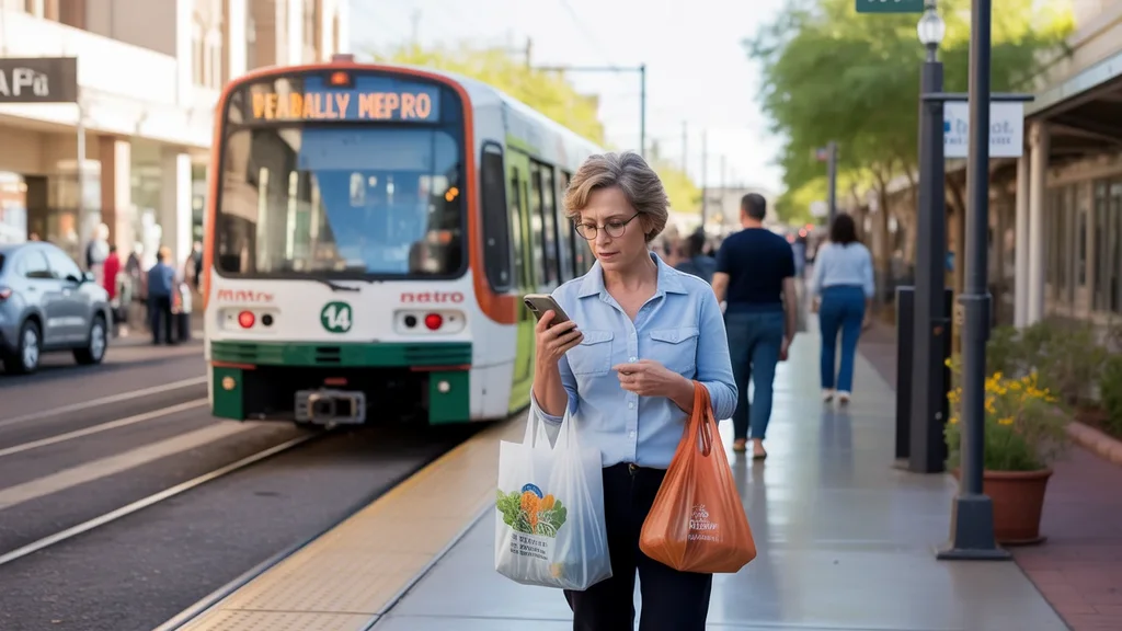 An eco-conscious resident disembarks the Valley Metro in central Phoenix, ready to walk to the weekly farmers market with her reusable totes.