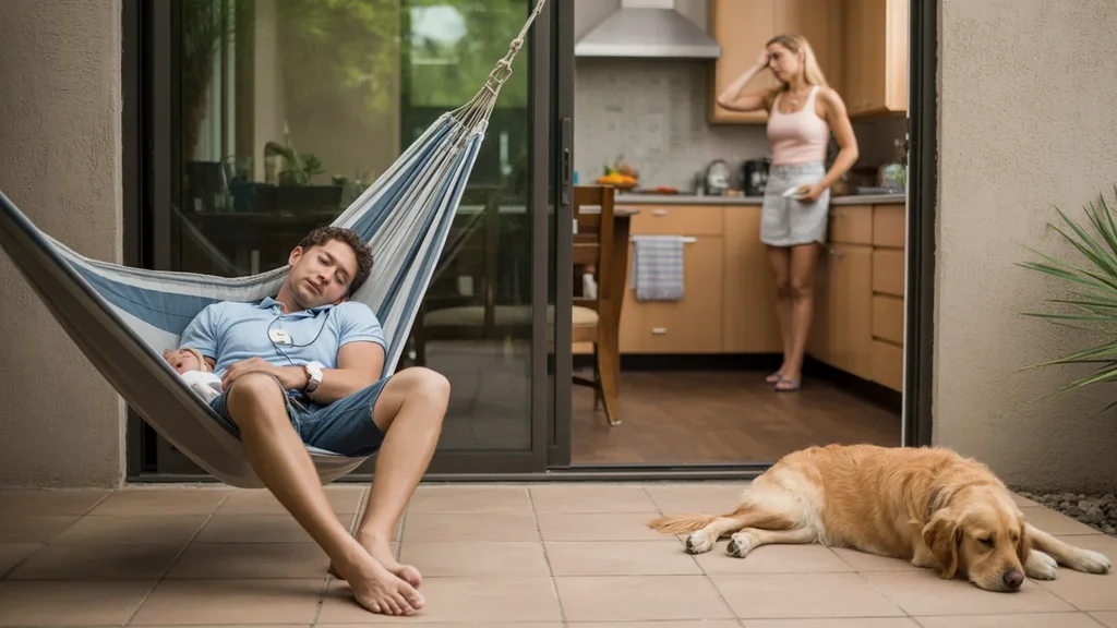 Father naps on shaded patio while wife cooks lunch inside Scottsdale home on hot summer day