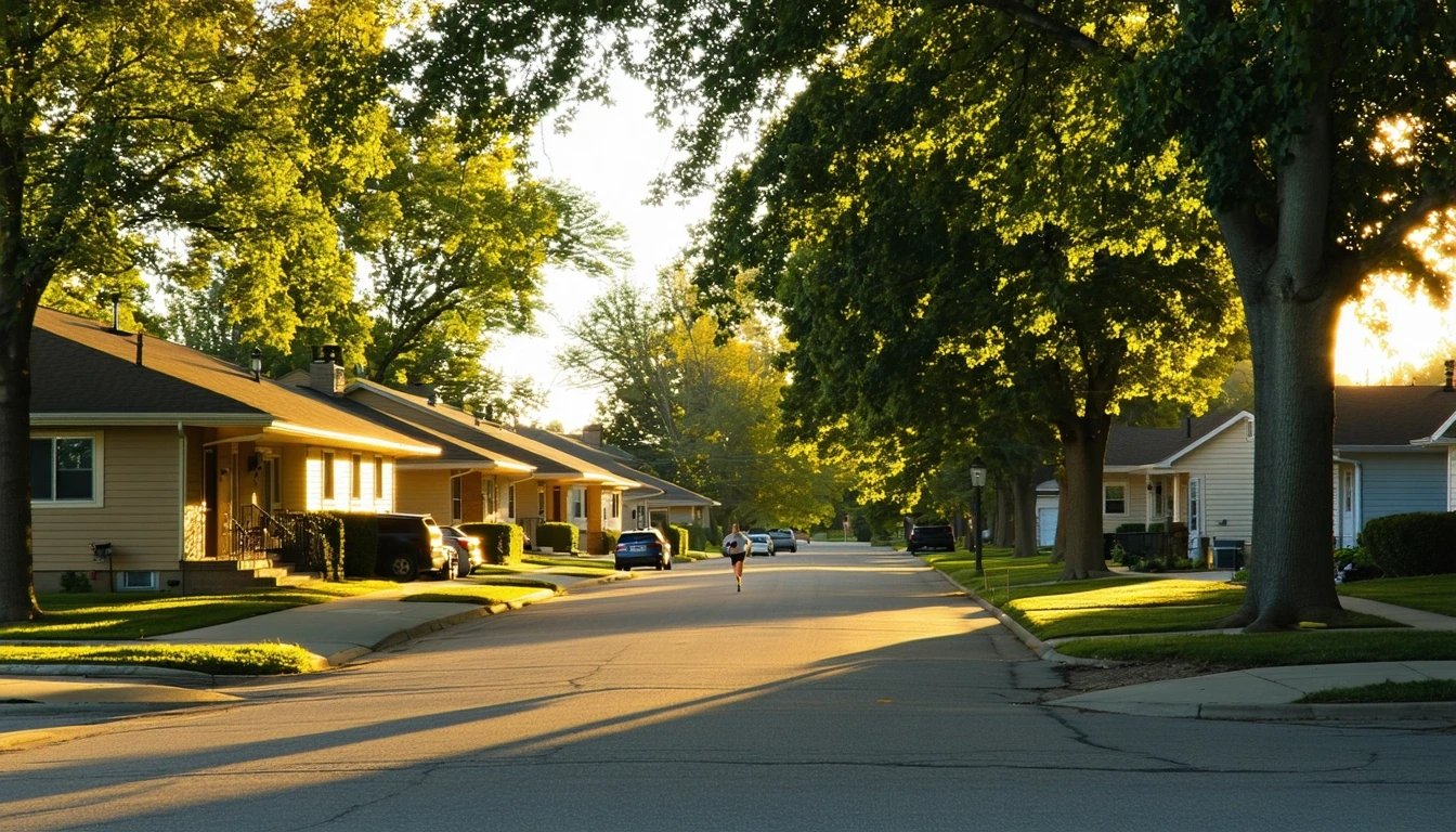 A peaceful residential street in Shawnee, Kansas at sunrise, with modest homes and leafy trees.