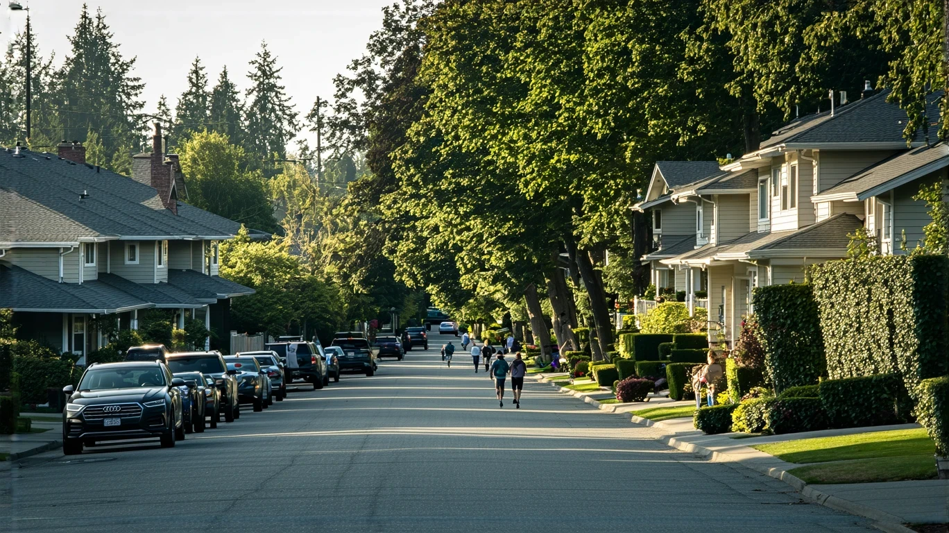 A tree-lined residential street in Shoreline, WA with craftsman-style homes and a family walking on the sidewalk.