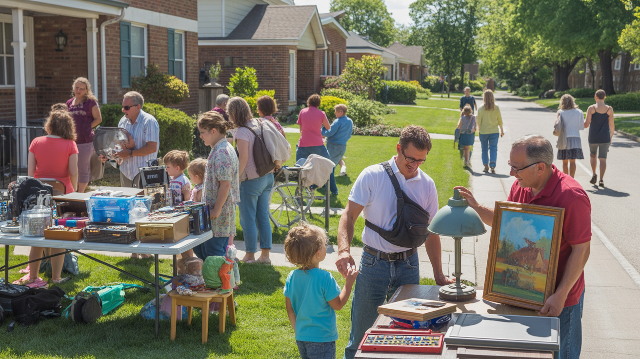 A friendly garage sale stretches between a condo and house in Skokie, IL, illustrating the tight-knit community vibe in this suburban neighborhood.