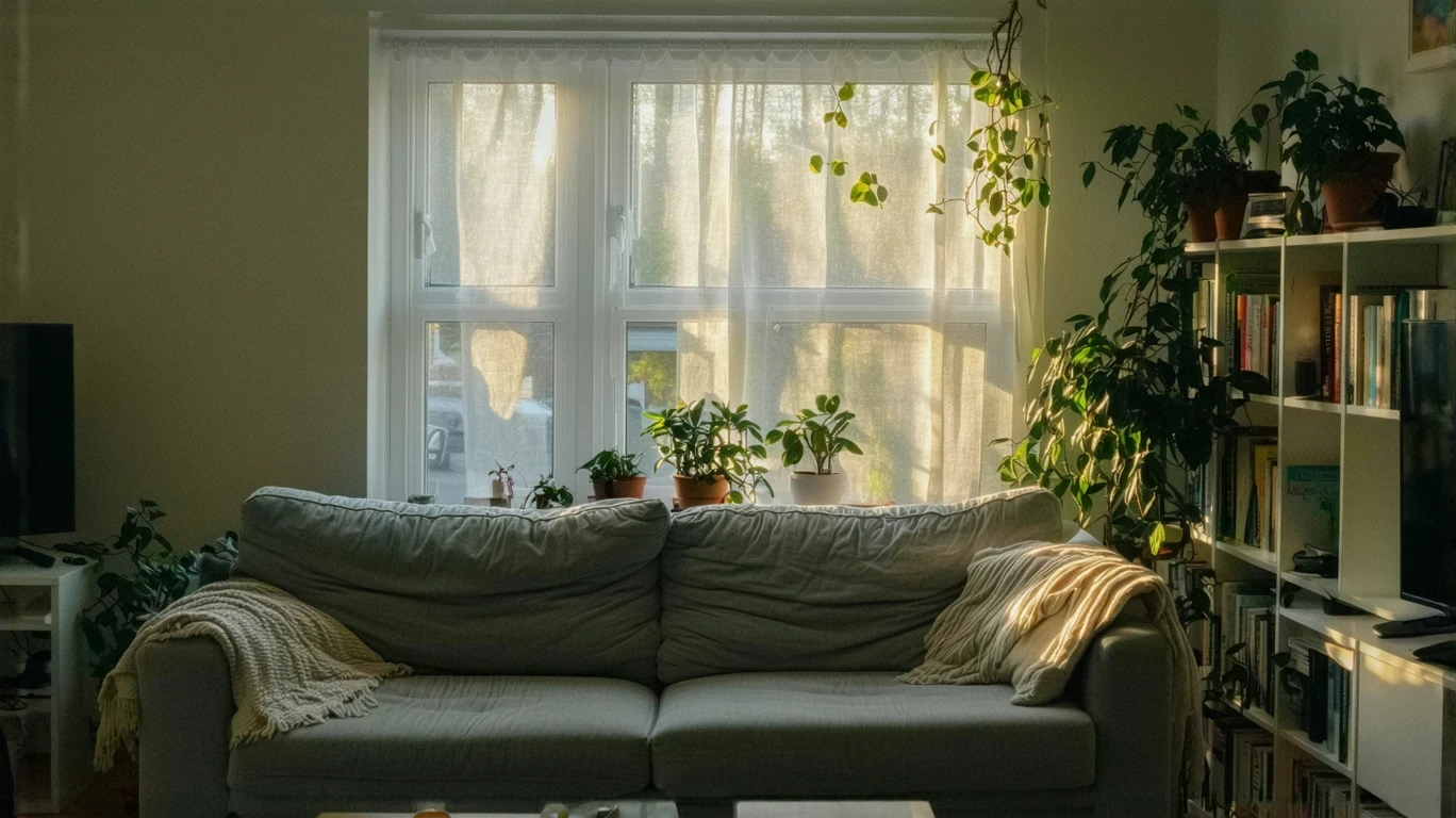 A small, simply furnished living room in St Petersburg with natural light coming through sheer curtains
