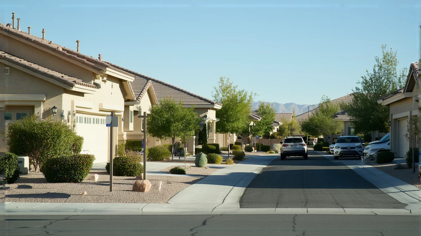 Suburban street in Summerlin South with stucco homes, xeriscaped yards, for sale sign