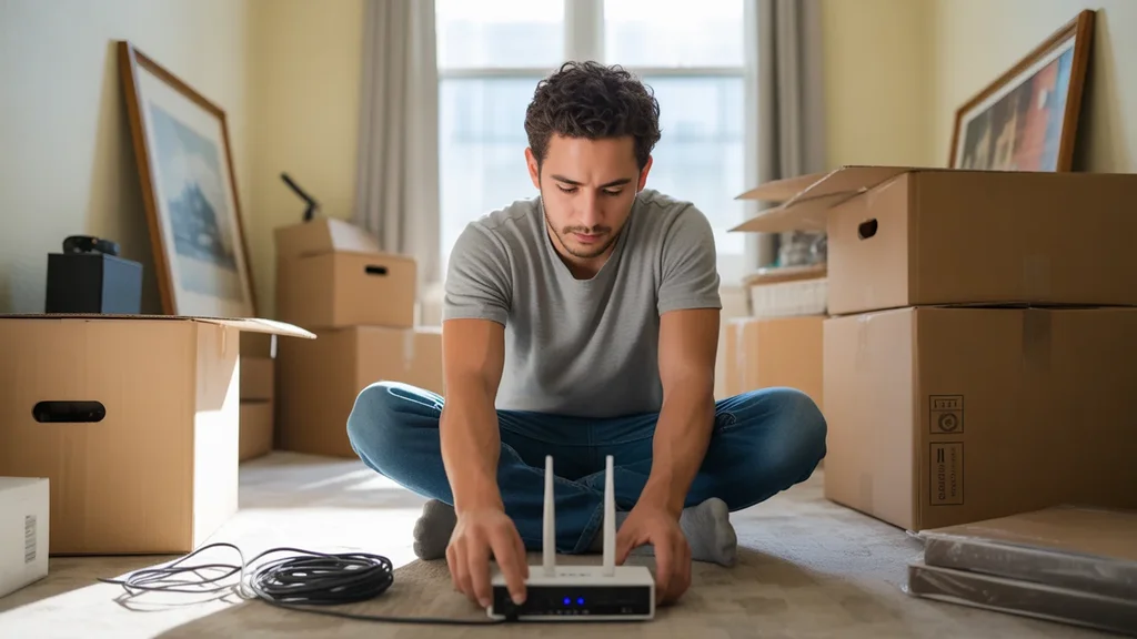 Man setting up Wi-Fi router in new Surprise, AZ apartment surrounded by moving boxes