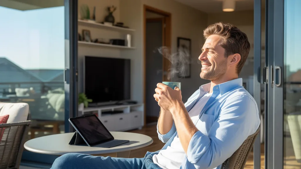Man drinking coffee on balcony with tablet, representing affordable internet and streaming in Taylorsville, UT